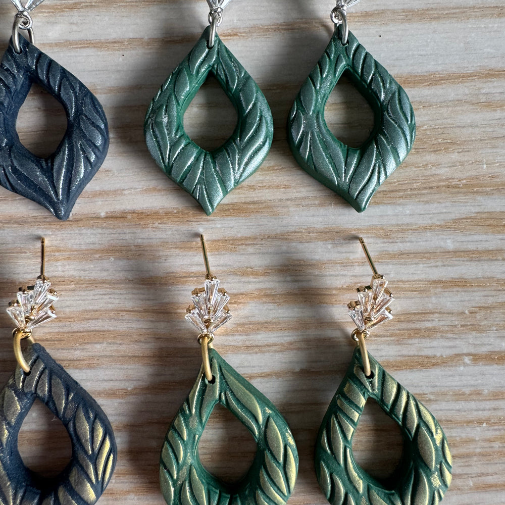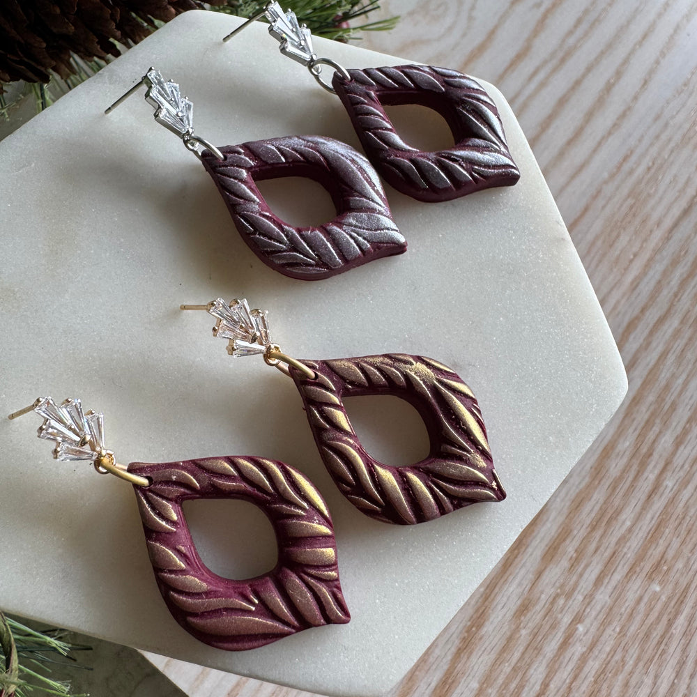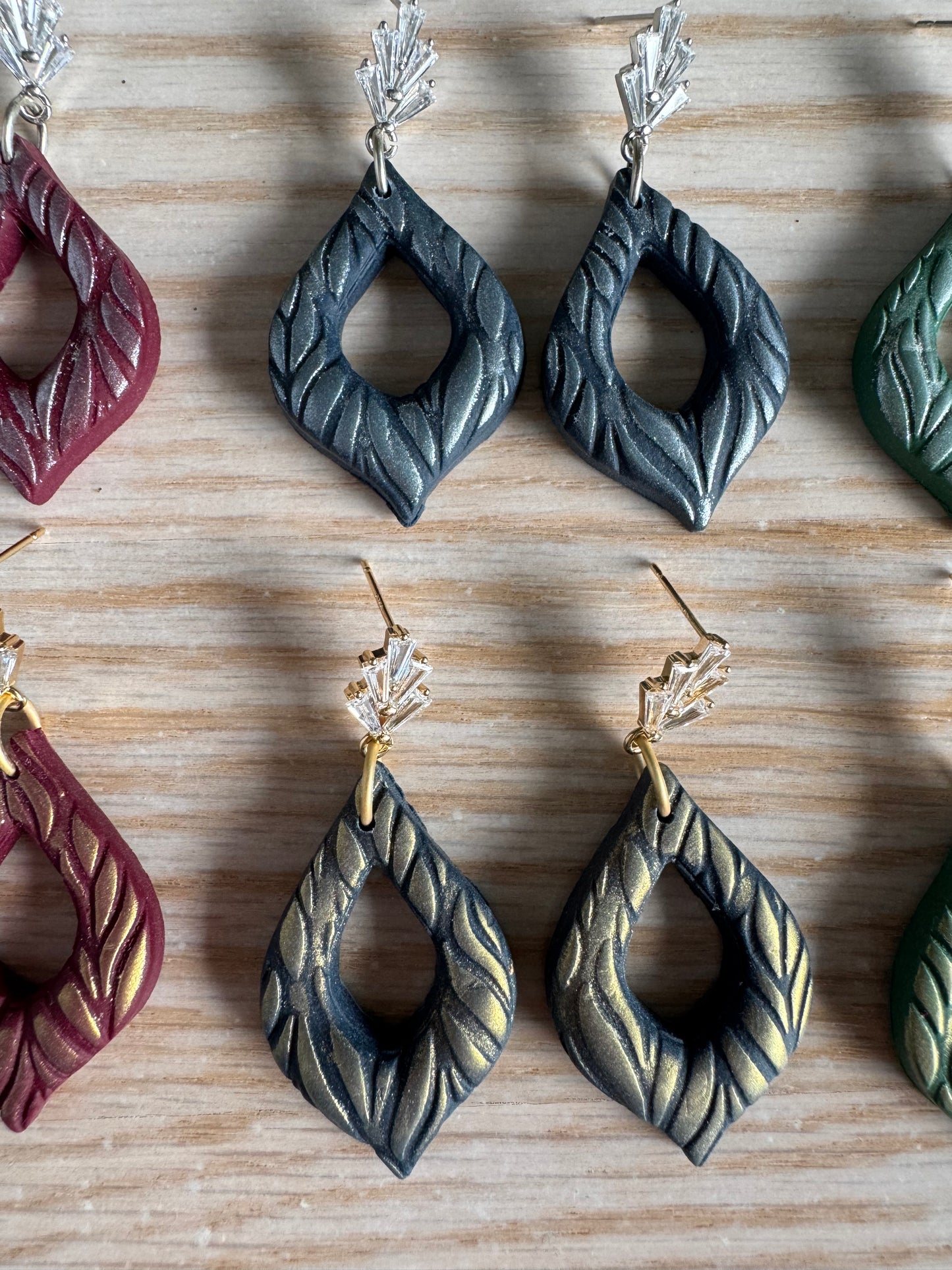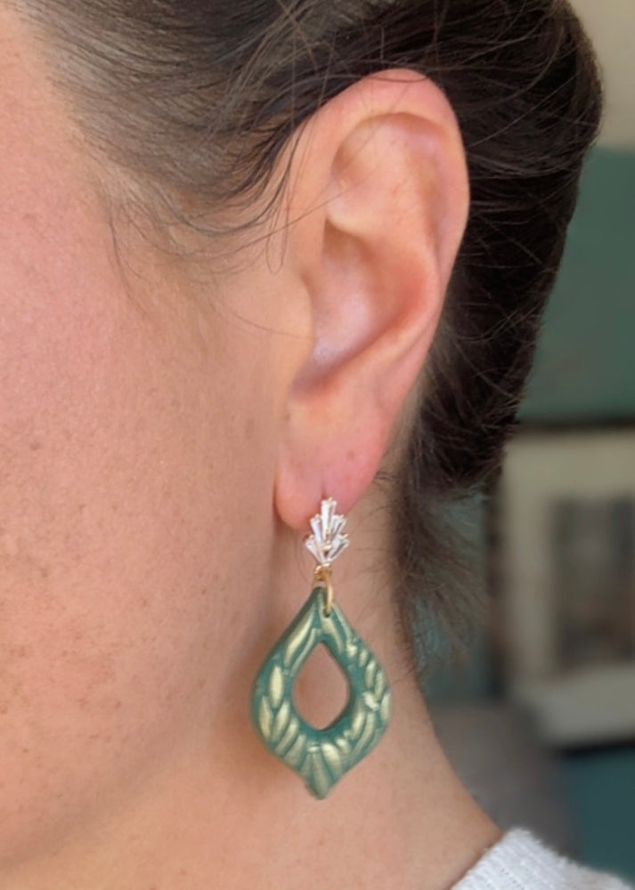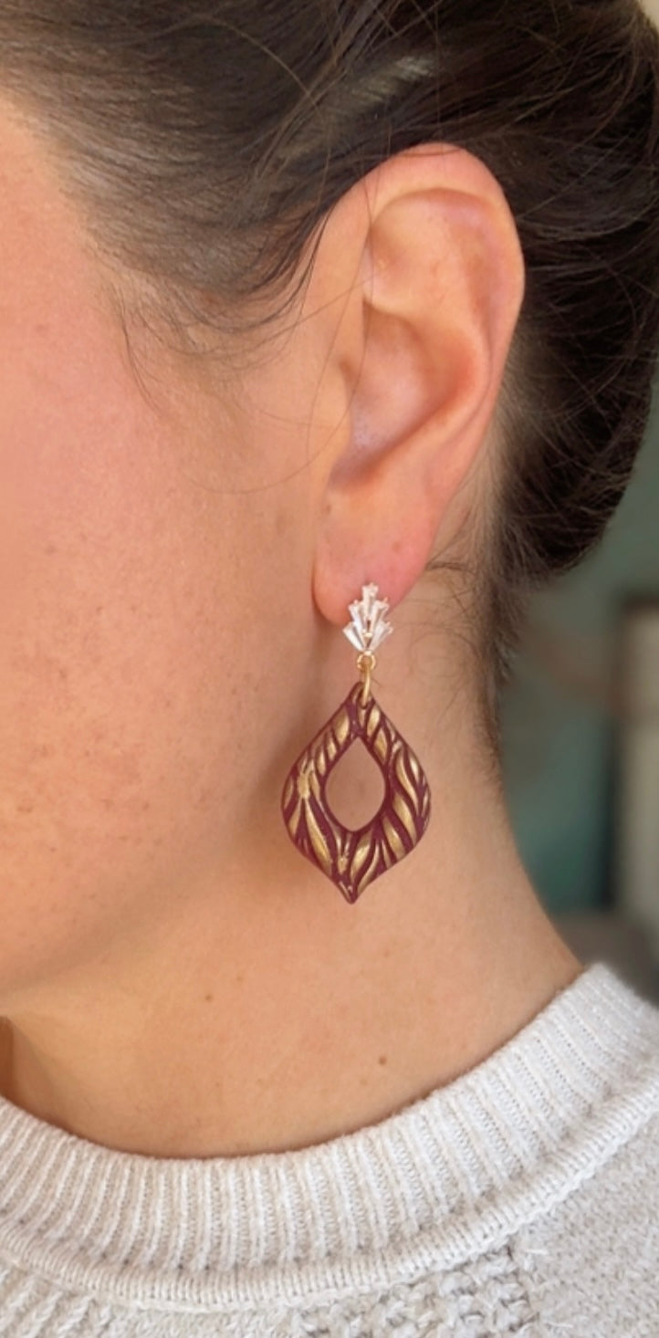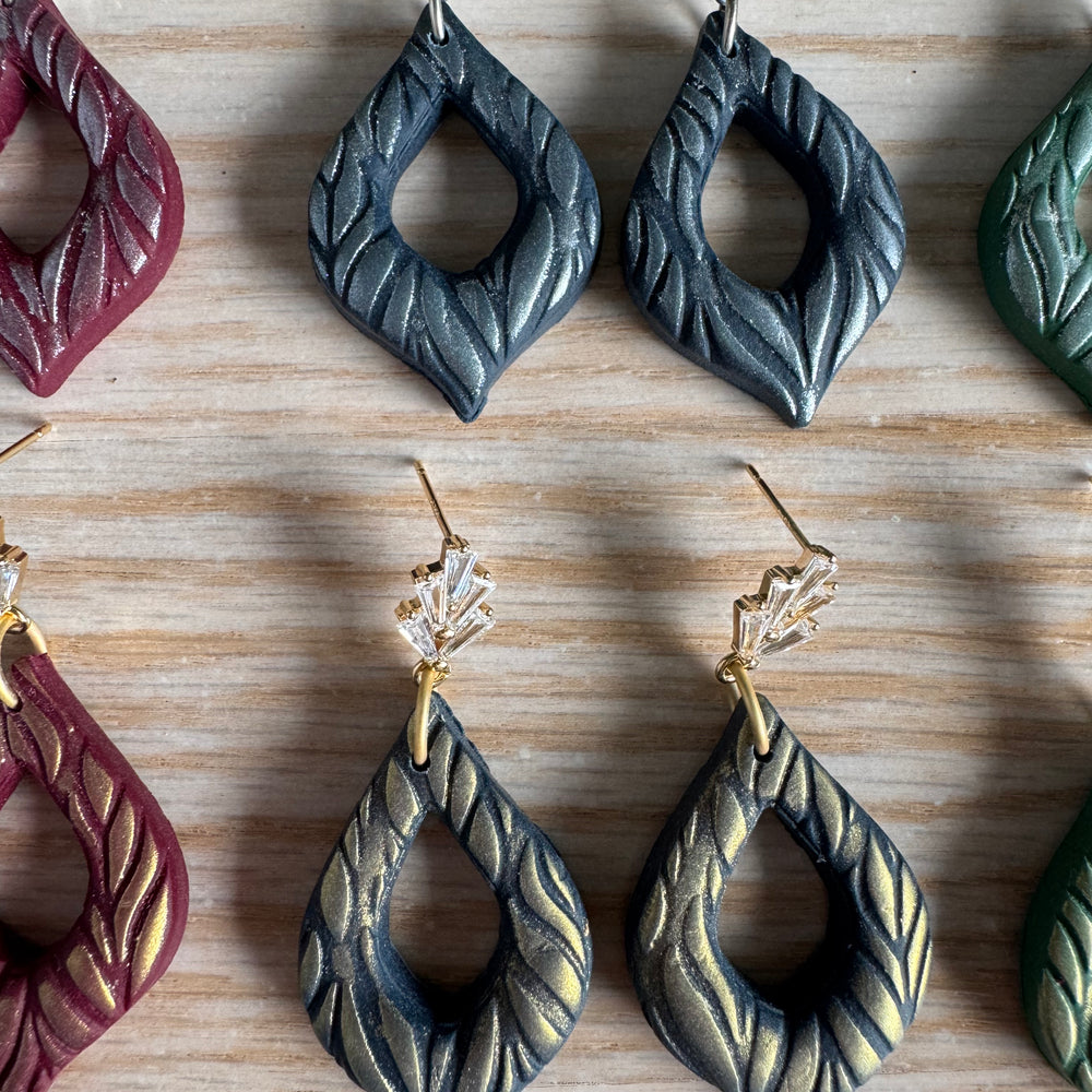 Beautifully textured clay in jewel tones featuring gold or silver accents. Inspired by vintage ornaments, our clay statement earrings are lightweight, finished on the front and back and are attached to a glittering cubic zirconia ear stud. All findings are nickel free. Choose your color and finish! Every pice is handcrafted and unique.