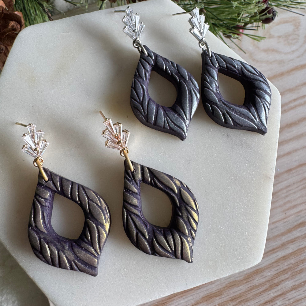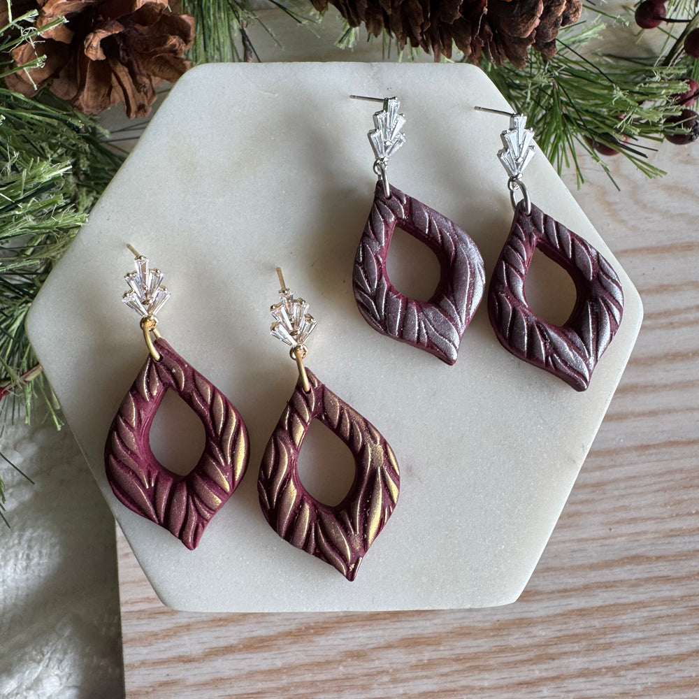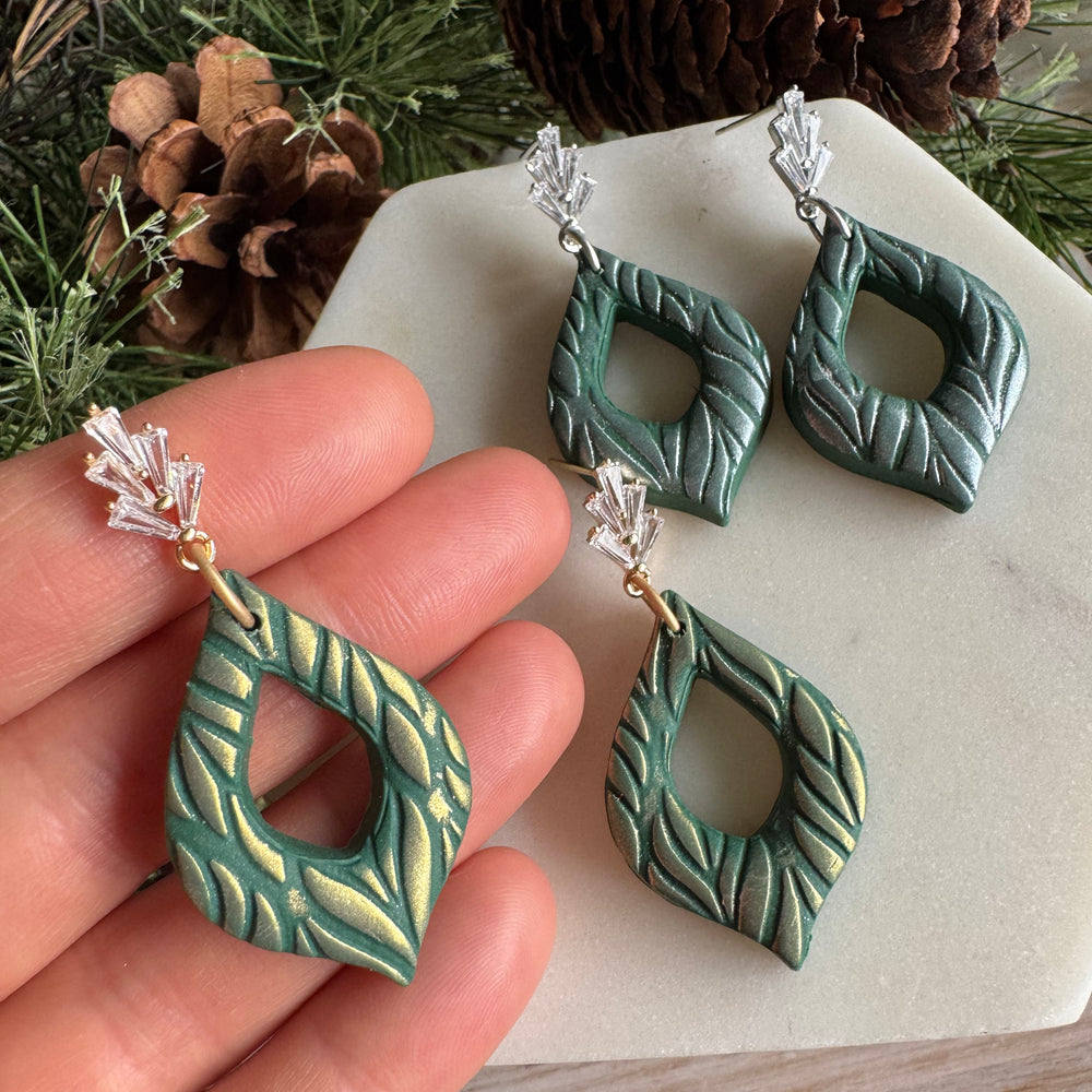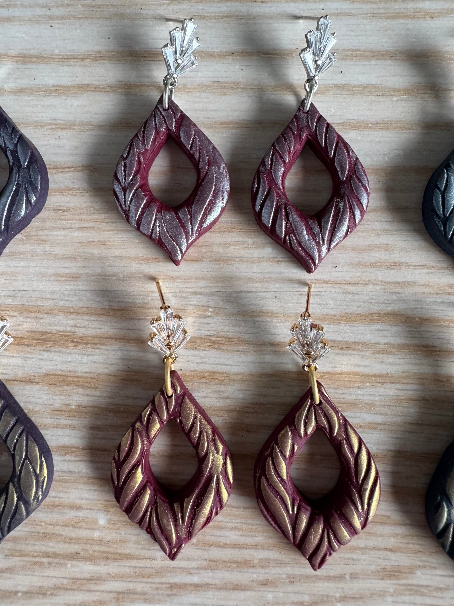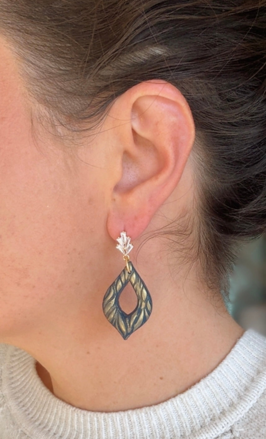 Beautifully textured clay in jewel tones featuring gold or silver accents. Inspired by vintage ornaments, our clay statement earrings are lightweight, finished on the front and back and are attached to a glittering cubic zirconia ear stud. All findings are nickel free. Choose your color and finish! Every pice is handcrafted and unique.
