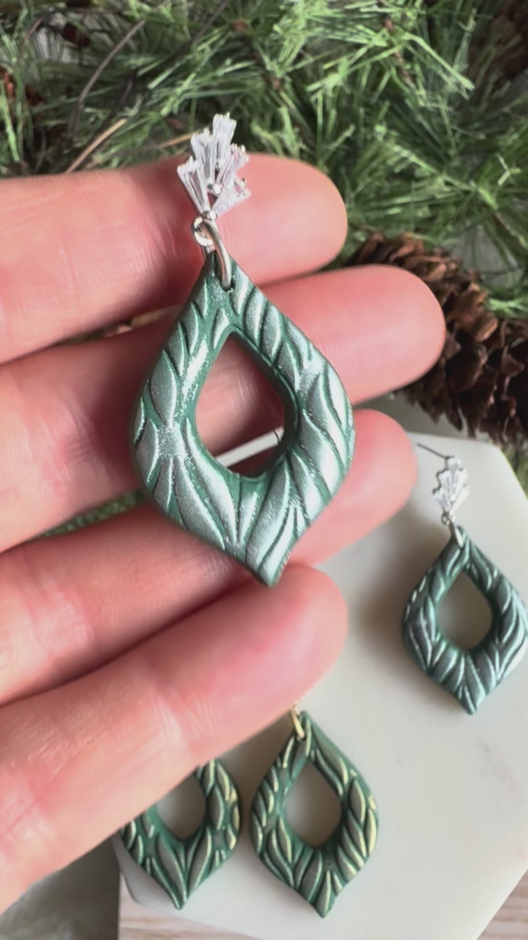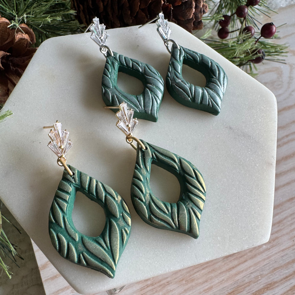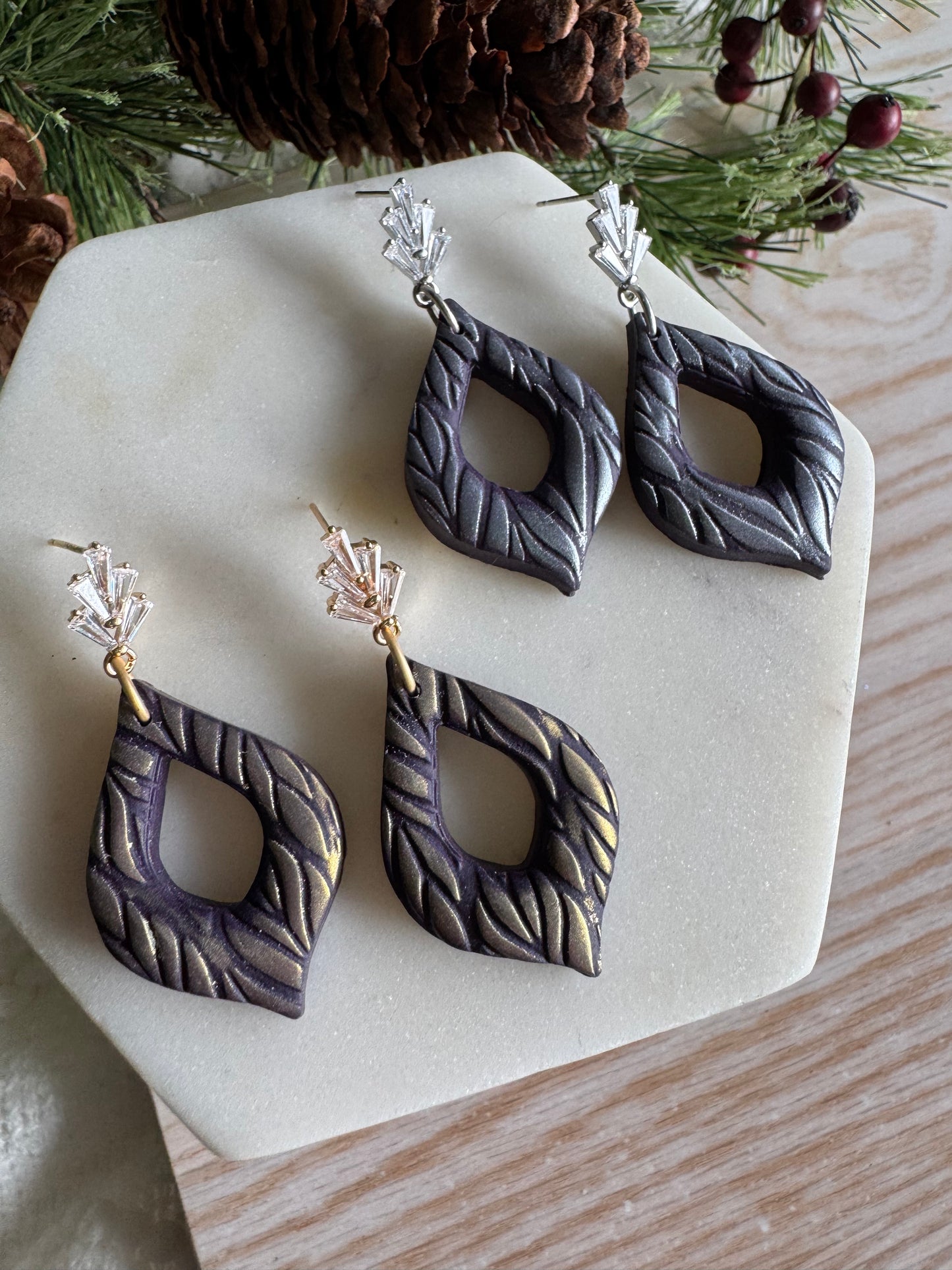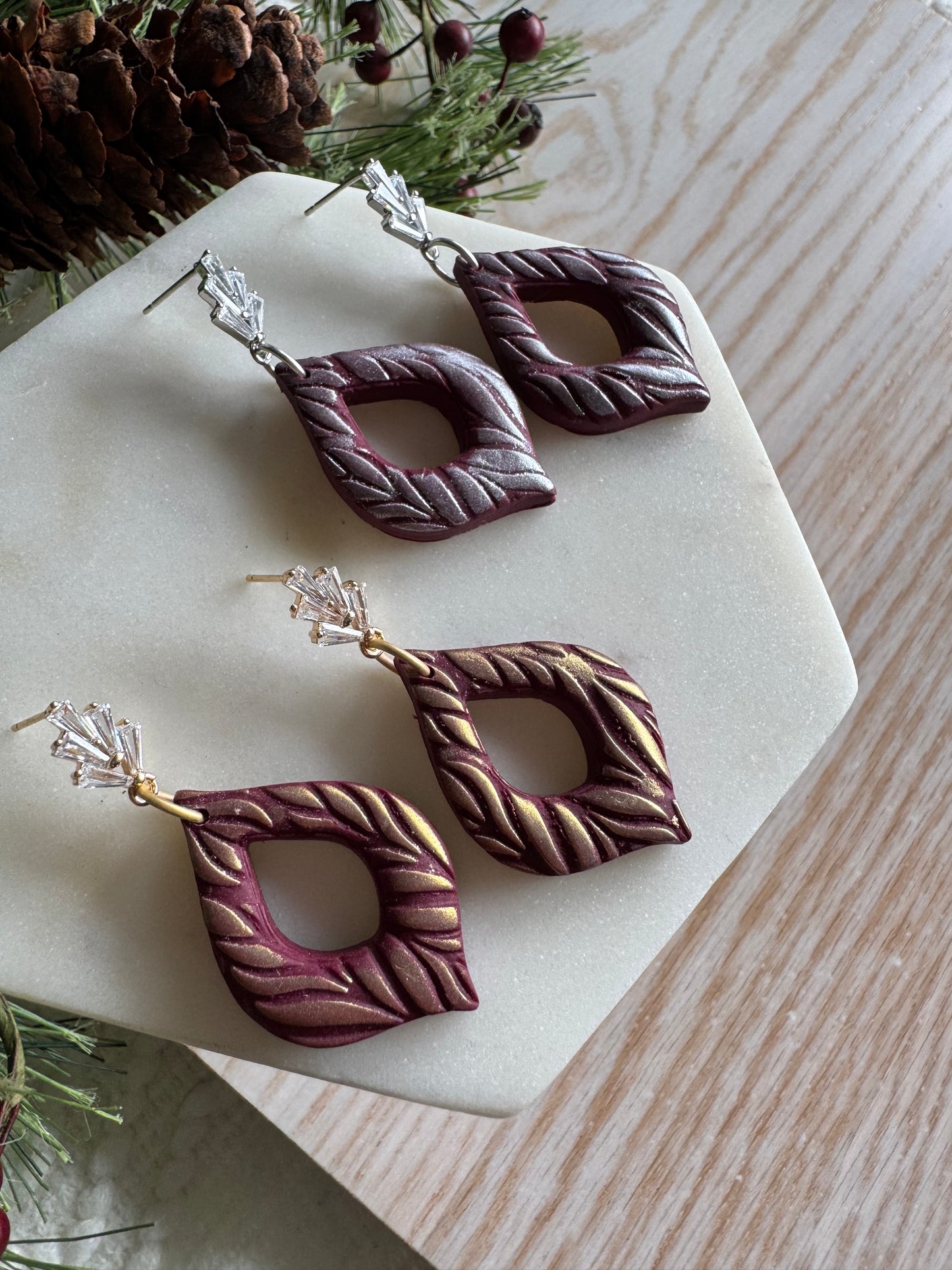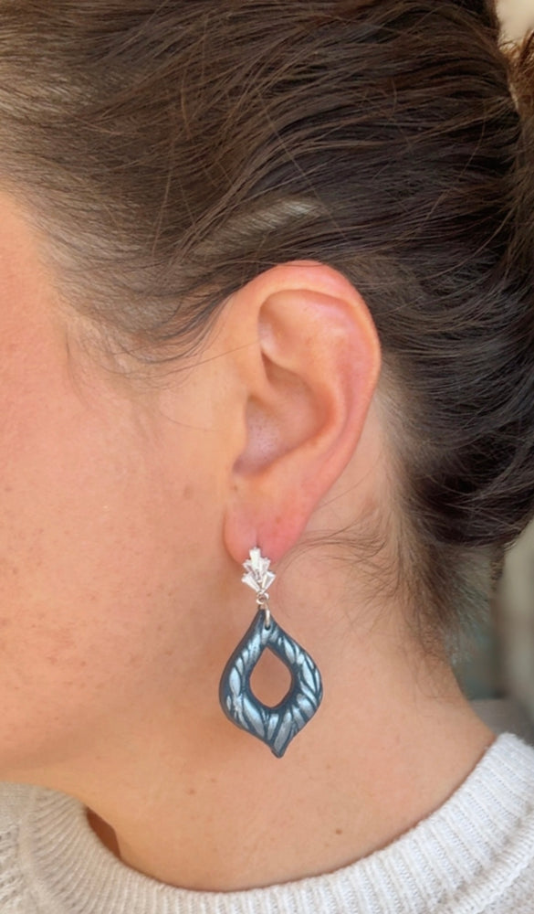 Beautifully textured clay in jewel tones featuring gold or silver accents. Inspired by vintage ornaments, our clay statement earrings are lightweight, finished on the front and back and are attached to a glittering cubic zirconia ear stud. All findings are nickel free. Choose your color and finish! Every pice is handcrafted and unique.