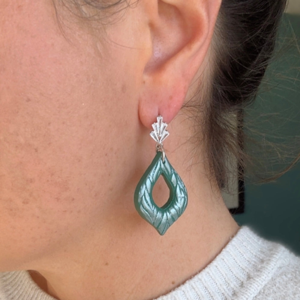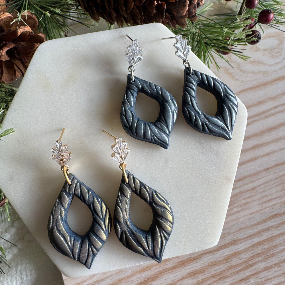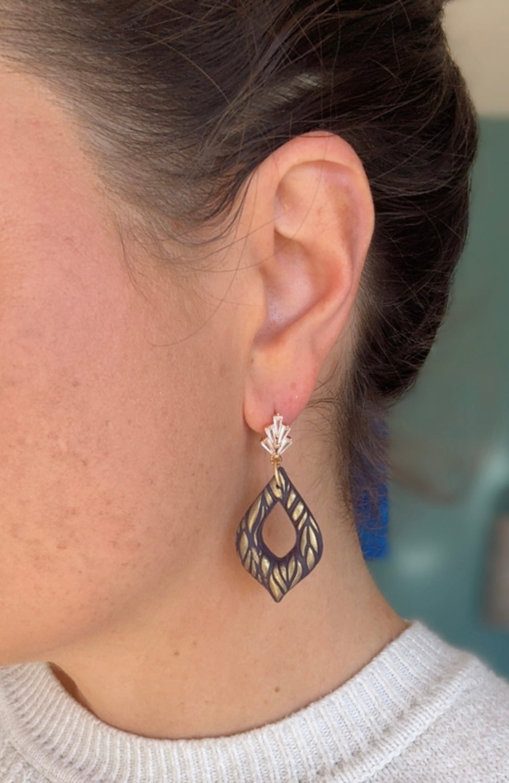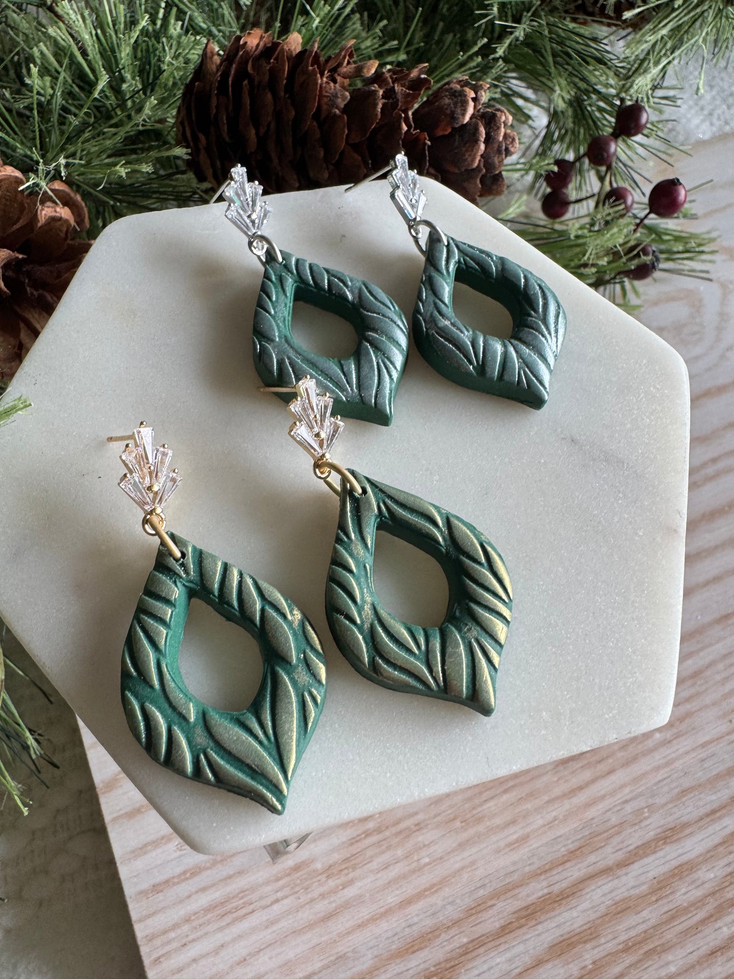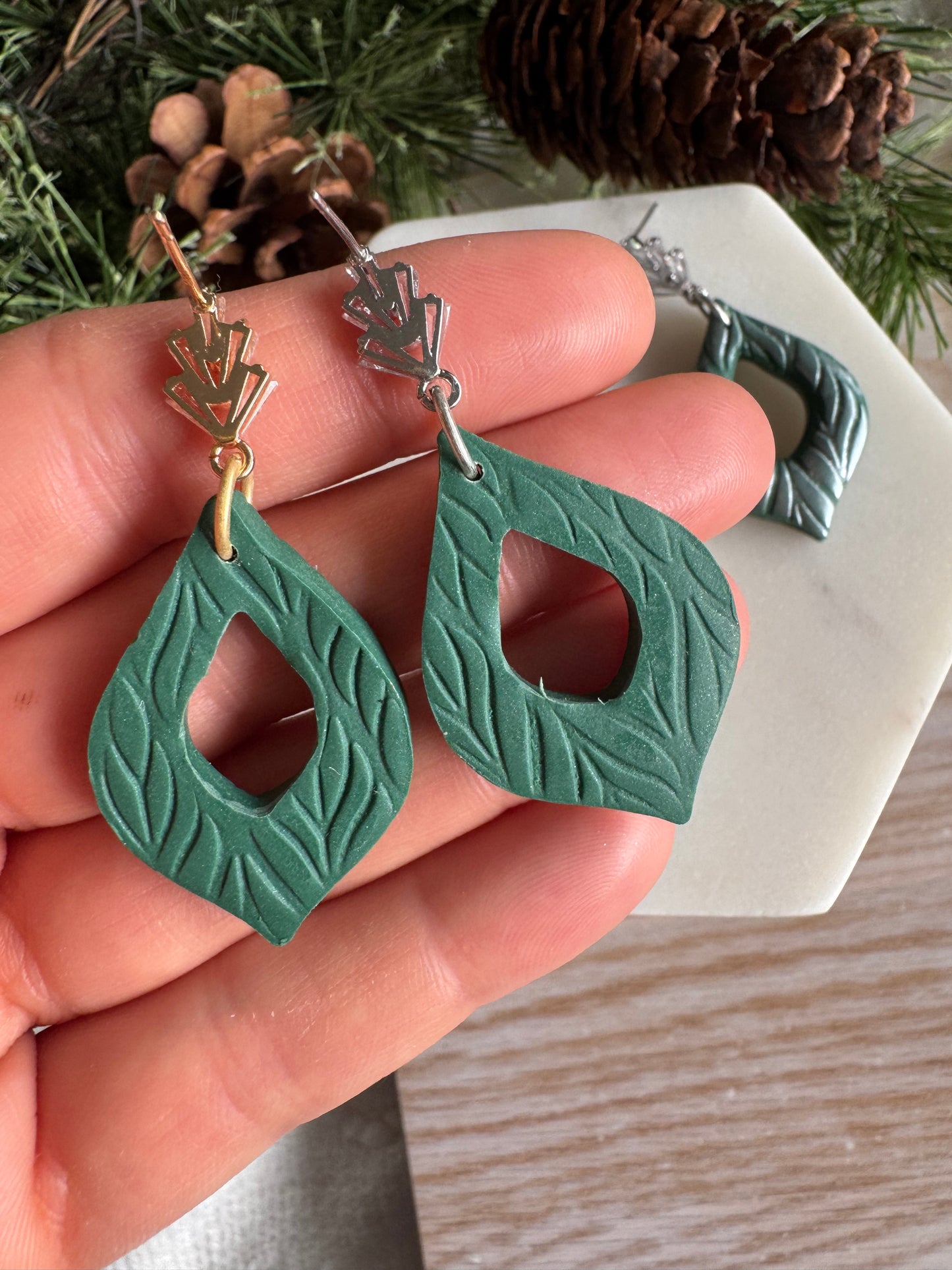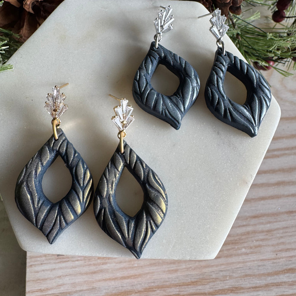 Beautifully textured clay in jewel tones featuring gold or silver accents. Inspired by vintage ornaments, our clay statement earrings are lightweight, finished on the front and back and are attached to a glittering cubic zirconia ear stud. All findings are nickel free. Choose your color and finish! Every pice is handcrafted and unique.