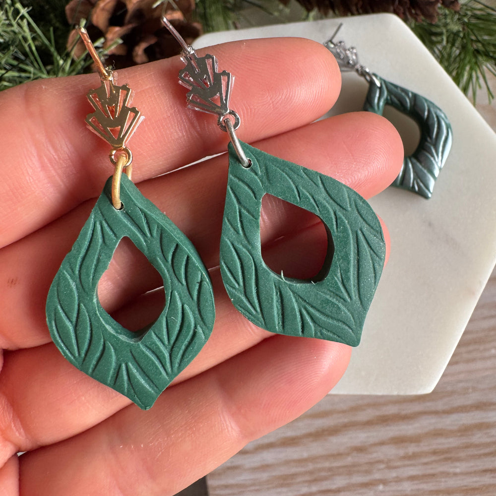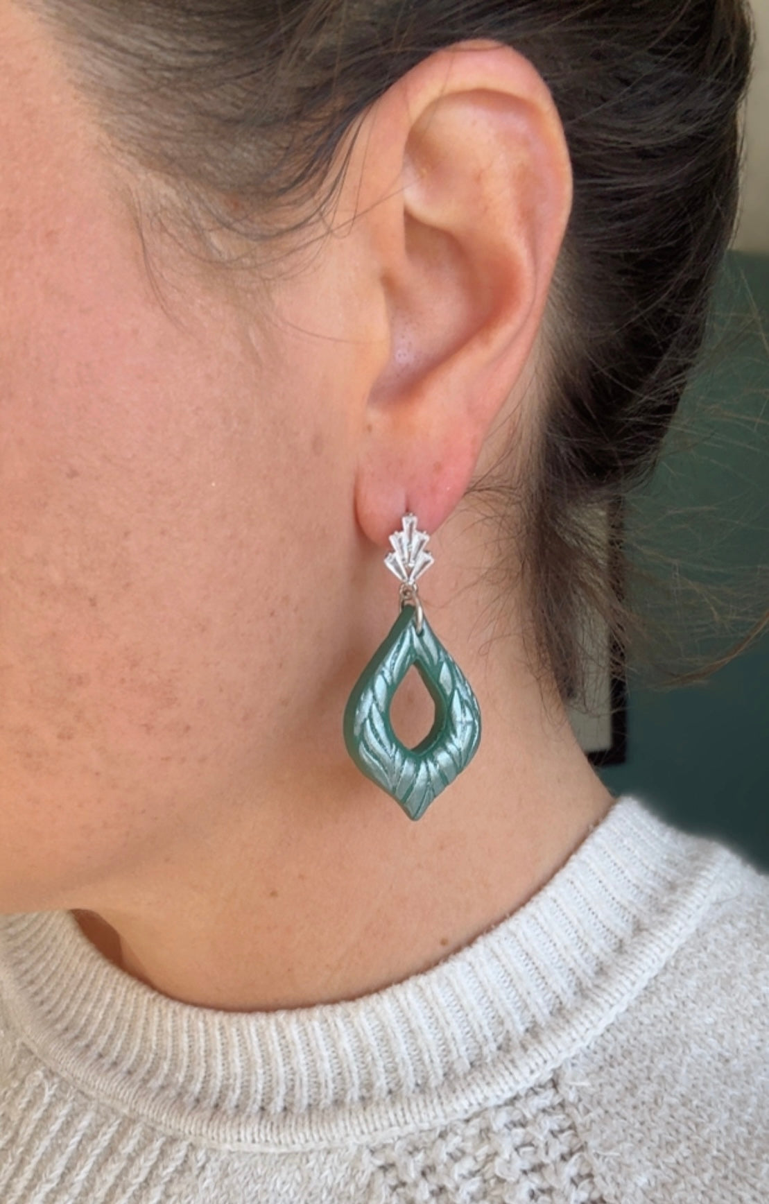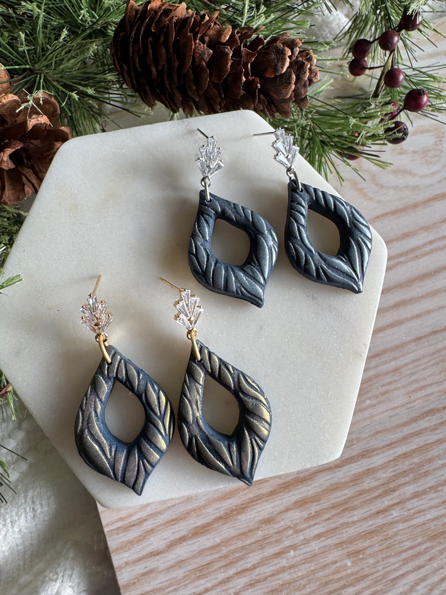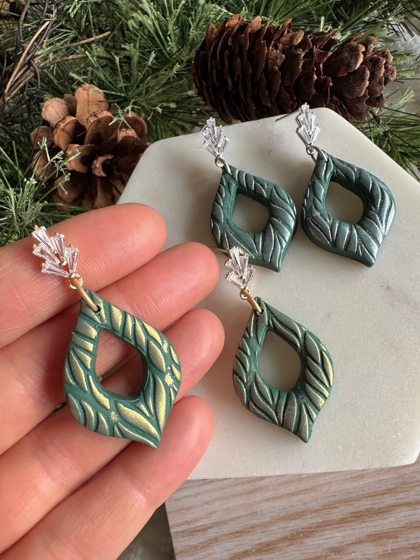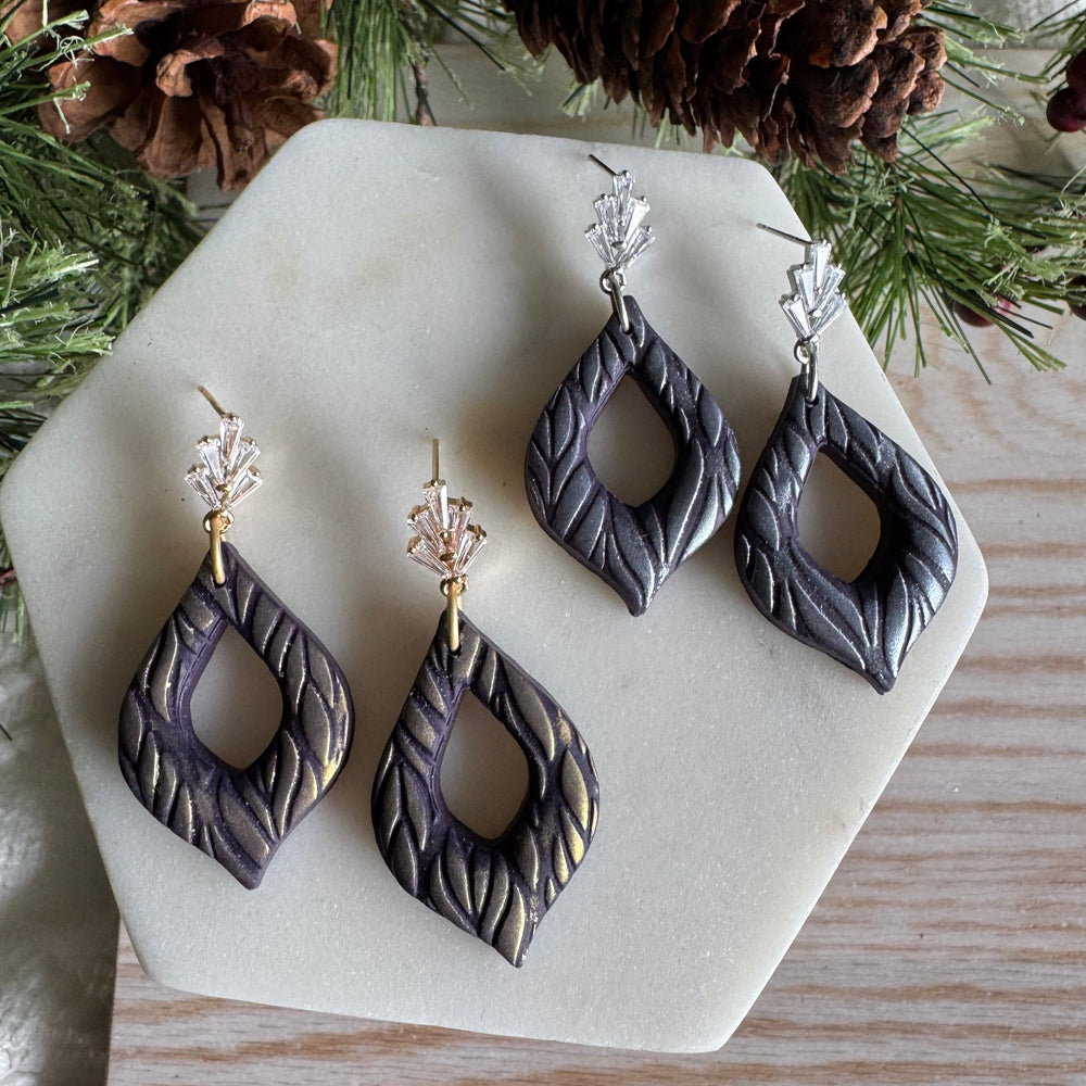 Beautifully textured clay in jewel tones featuring gold or silver accents. Inspired by vintage ornaments, our clay statement earrings are lightweight, finished on the front and back and are attached to a glittering cubic zirconia ear stud. All findings are nickel free. Choose your color and finish! Every pice is handcrafted and unique.