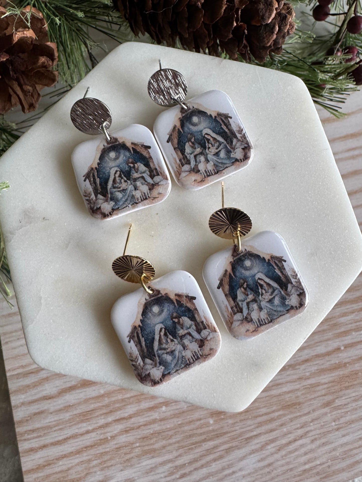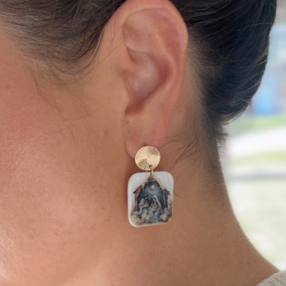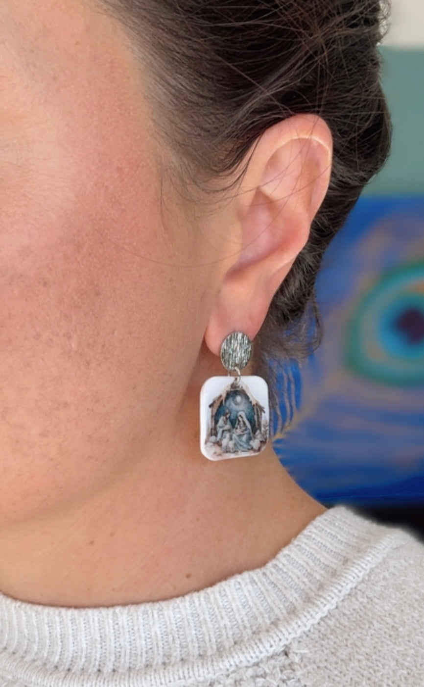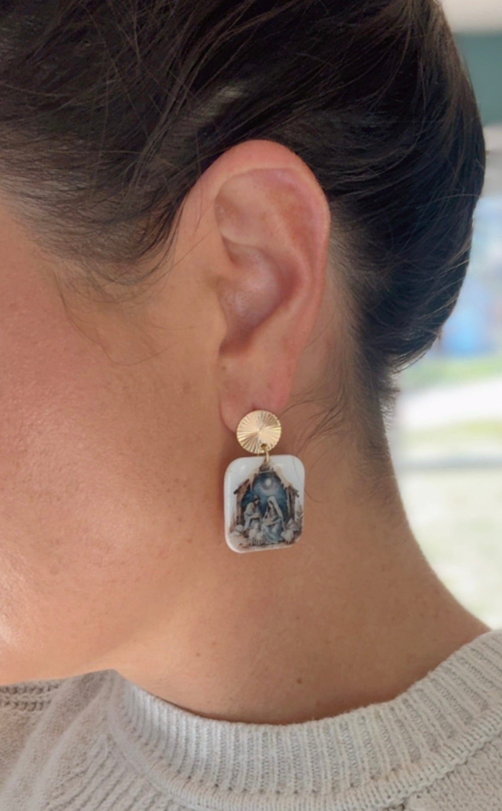 Beautiful Holy Nativity Scene Clay Earring with a silver or gold accents. The gold posts feature a bright sunburst design and the silver post have a lovely brushed finish. Our materials are all nickel-free. Our pieces are lightweight and individually handcrafted with lightweight clay.