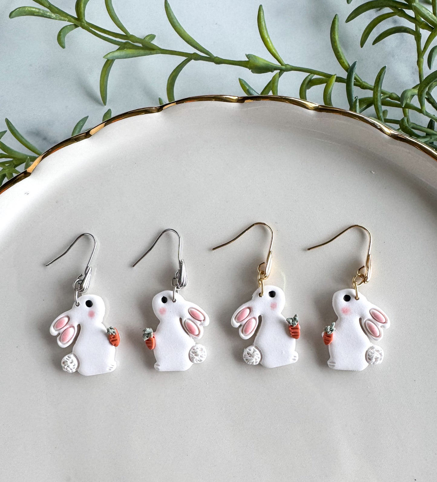 Cutie little easter bunnies with their carrots! Handcrafted polymer clay, attached to nickel-free silver or gold-plated brass ear wires.