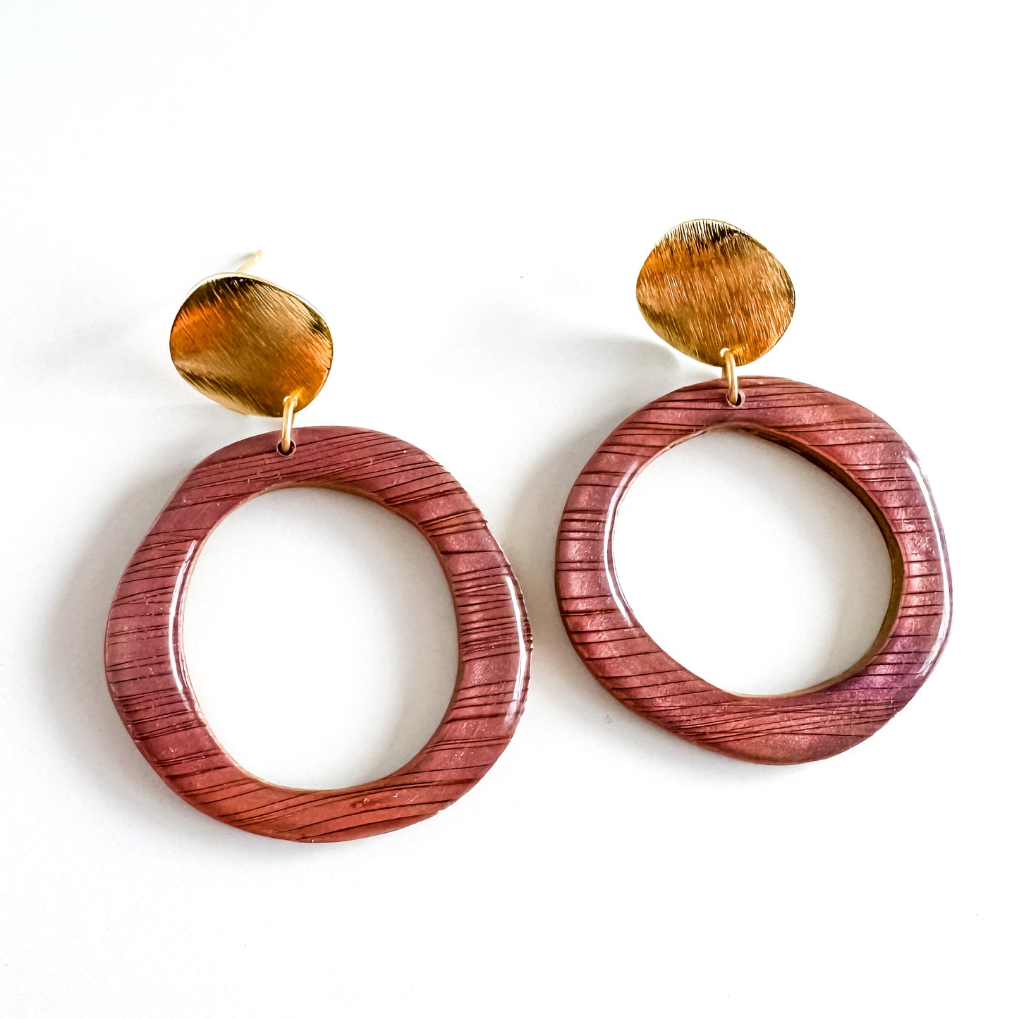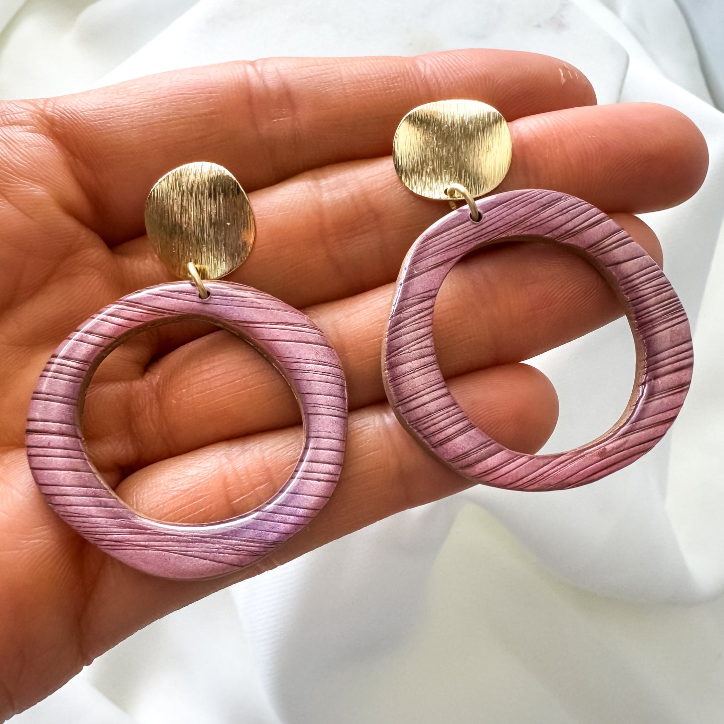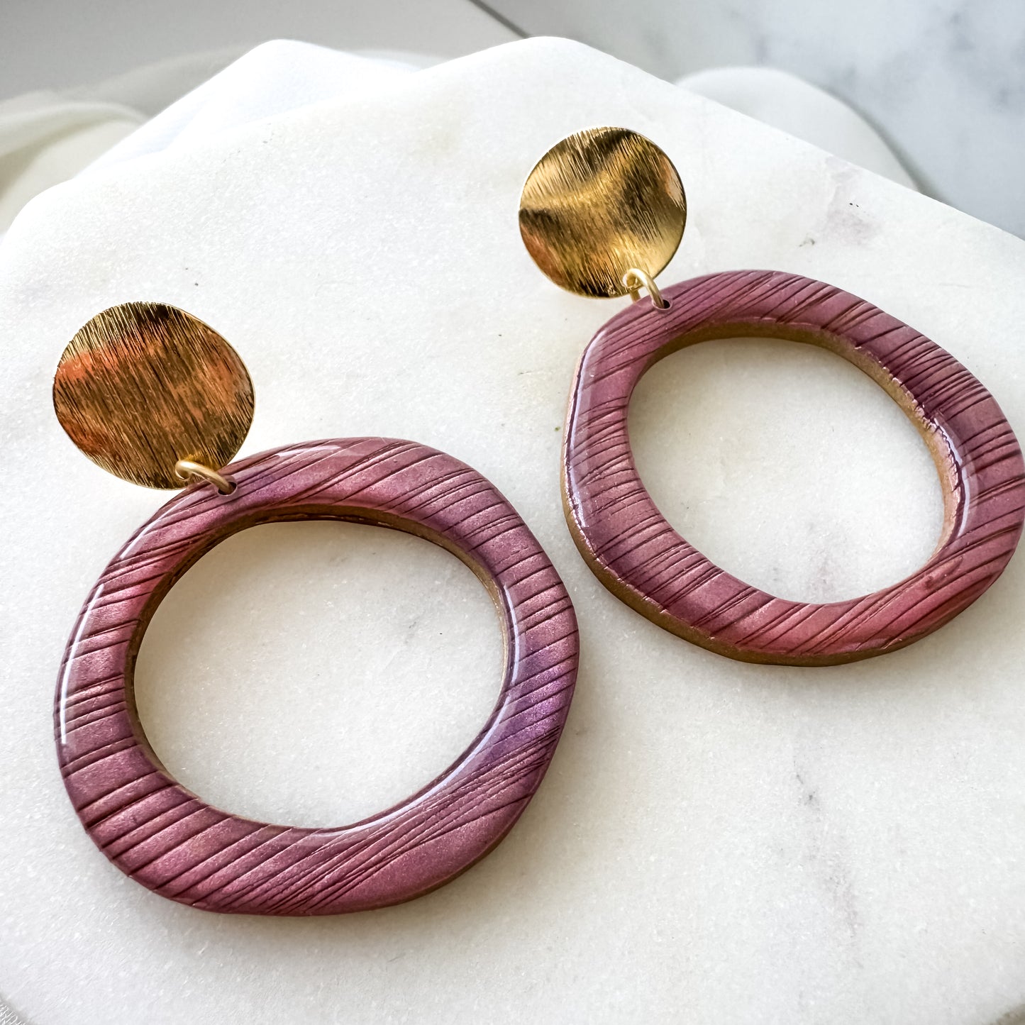 Our Glimmer Collection features vibrantly colorful mica powders blended on clay and finished with resin. They change color slightly depending on the light and angle! The earrings are super LIGHTWEIGHT and easy to wear all day, and the ear wires are NICKEL-FREE!