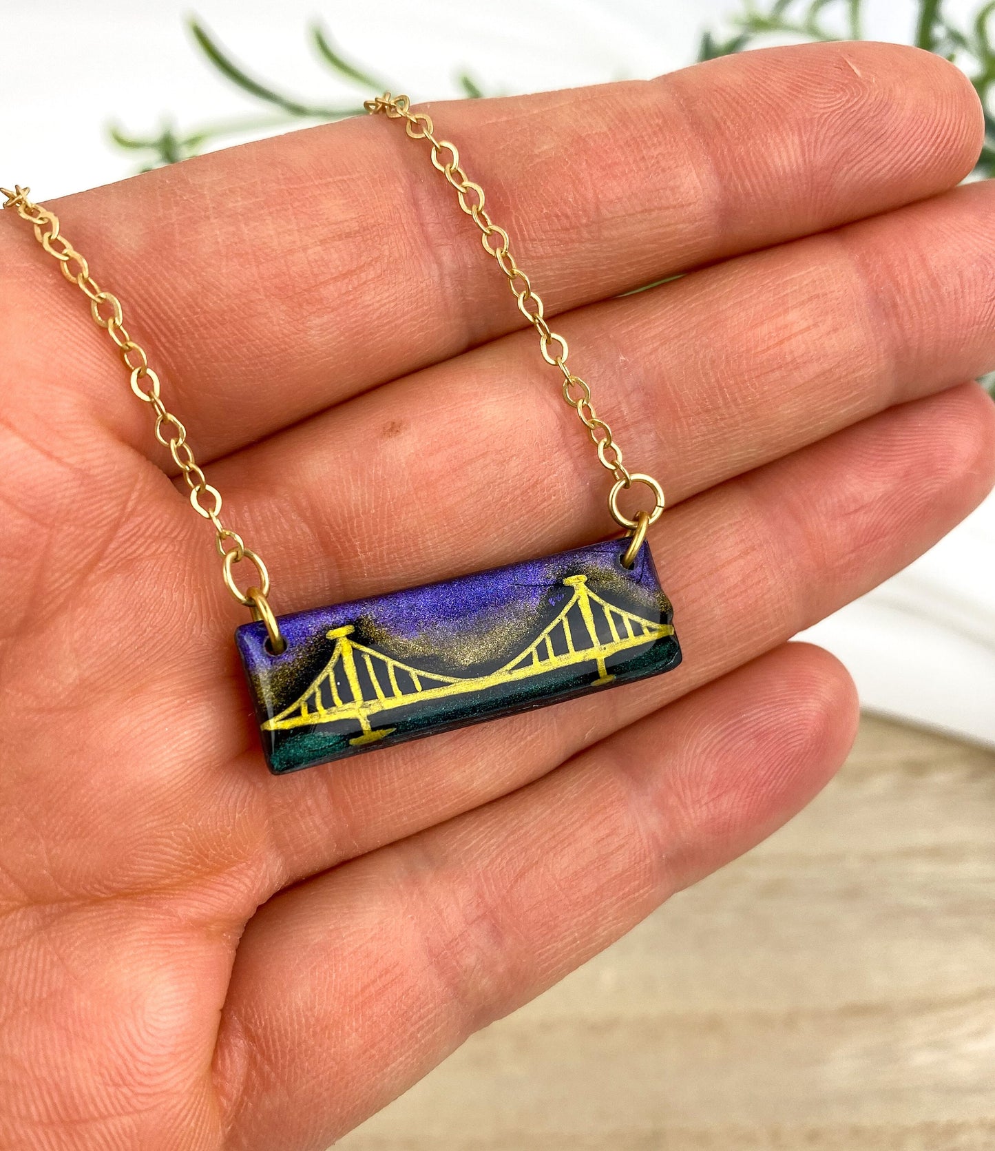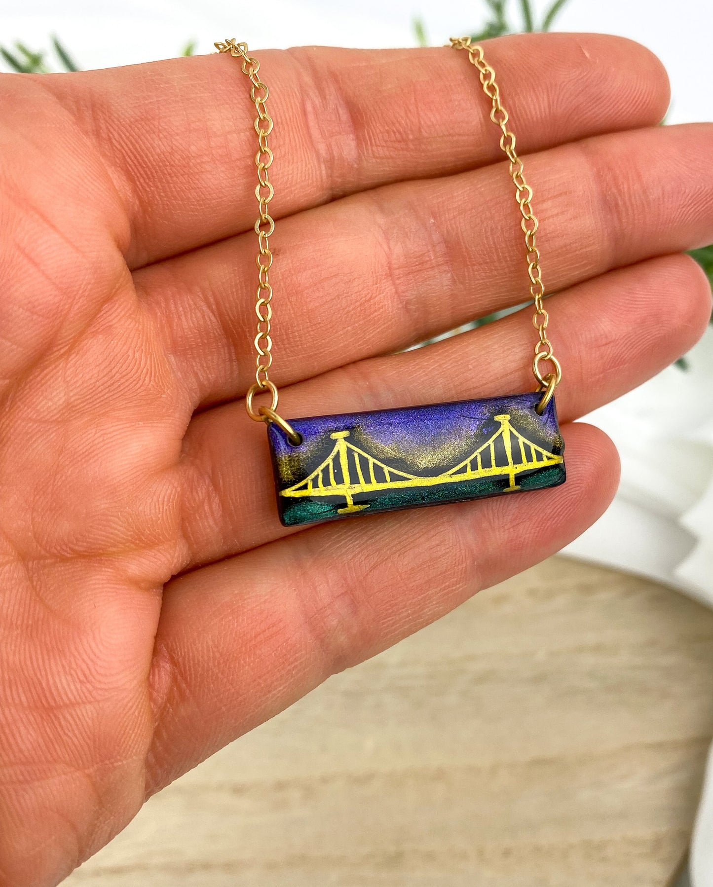 Each piece is hand drawn with a metallic gold ink that shines beautifully in the light. It has a bit of colorful metallic, shimmering mica powder to highlight the sky and river. It is carefully finished with resin on the front to protect and showcase the depth of color and create a brilliant shine! The pendant is attached to a 16" nickel-free gold-plated brass cable chain that can fully extend up to 18" and has a lobster claw clasp closure.